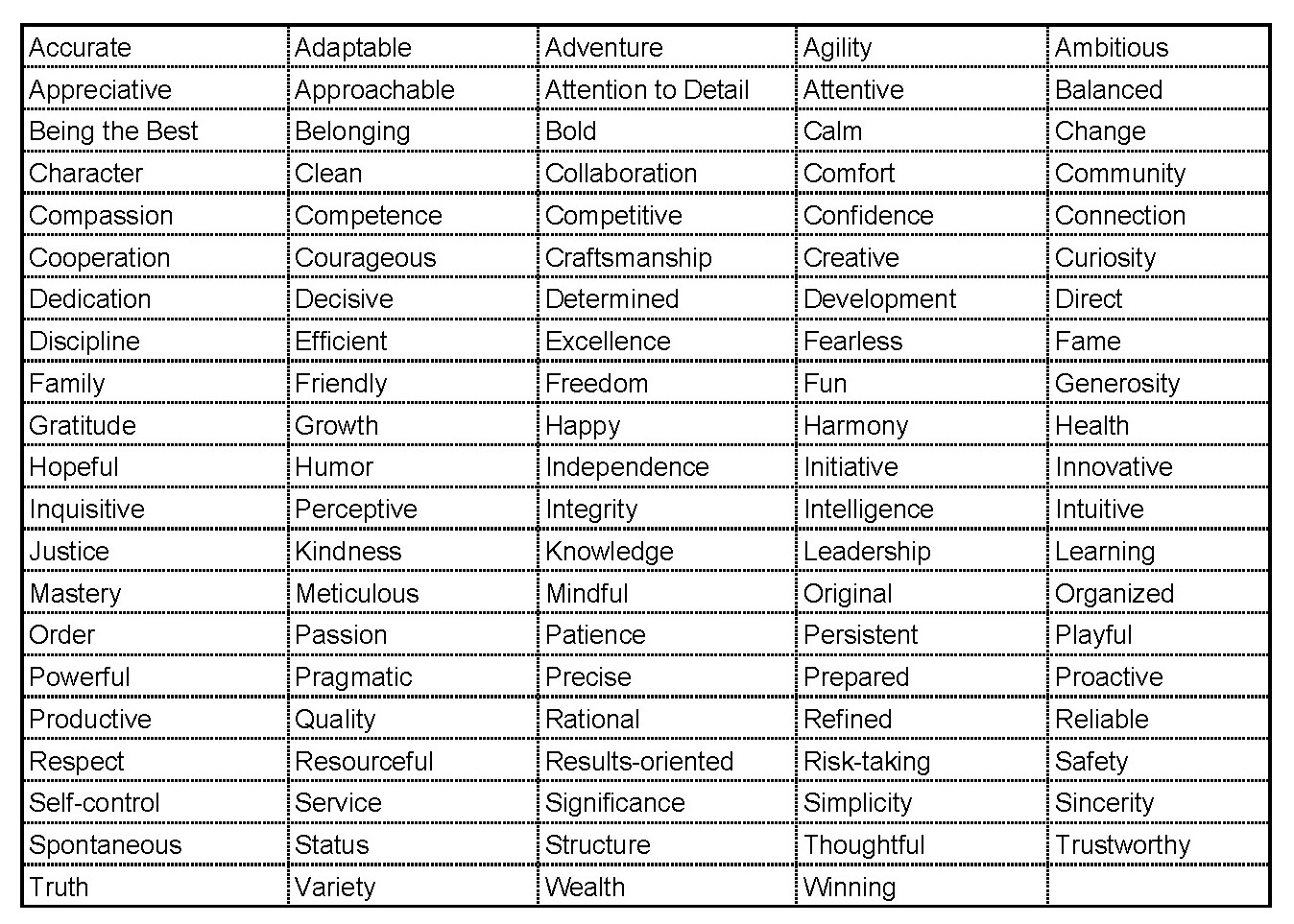 To help with that reflection, here’s a set of values commonly used in behavioral research and coaching. Reviewing a list like this can make it easier to spot the themes that matter most to you. Notice which words energize you, which feel neutral, and which feel irrelevant. That pattern of words is often more honest than your first impulse at which ones you align with. You might want to write these down as you start to think about this to ensure that you are able to track the patterns.