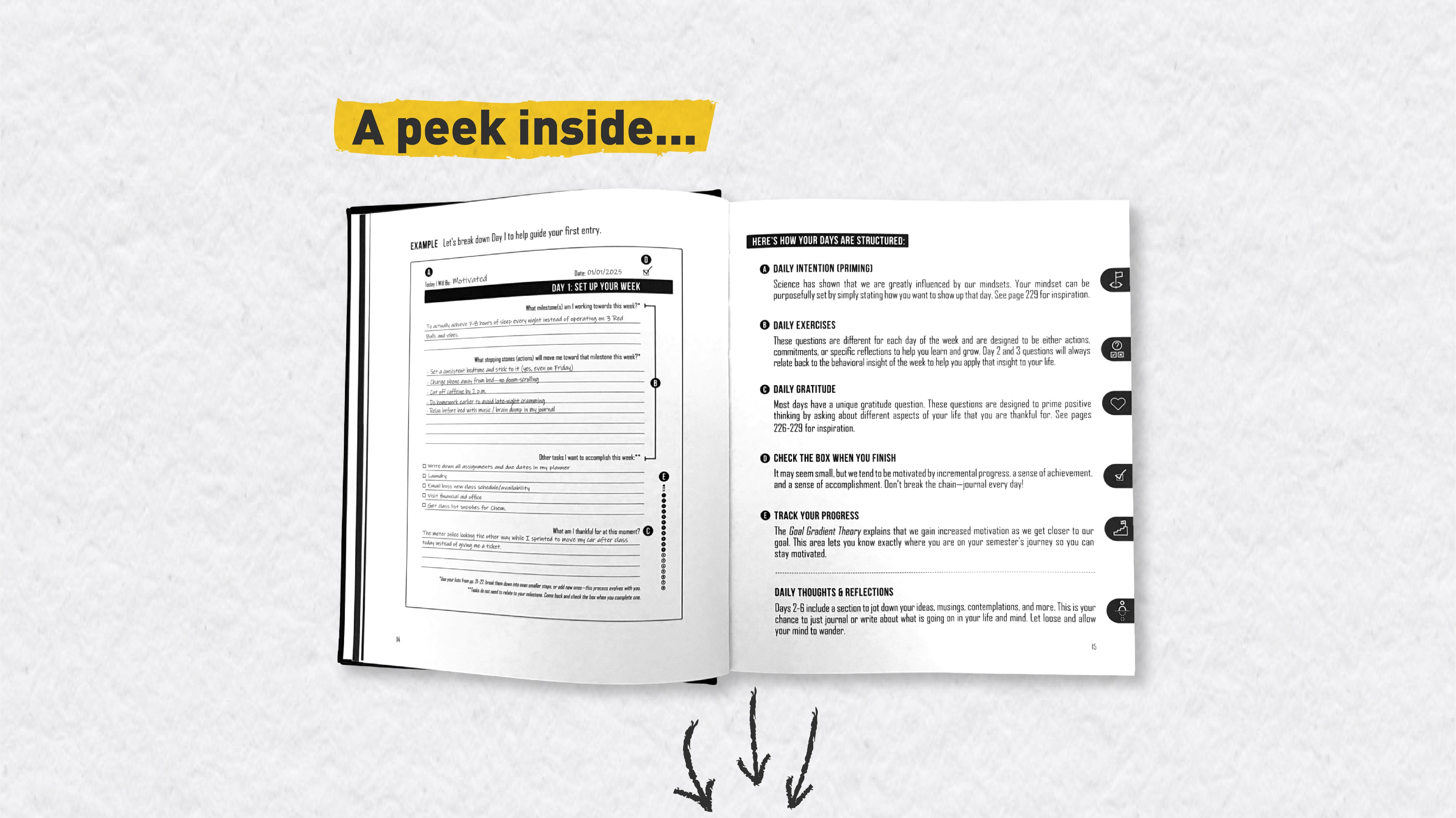 The Brain Shift Journal: College Success Edition is a semester-based, structured journal created by a team of behavioral scientists and goal experts. It bridges the gap between intention and action—guiding students through the proven strategies that lead to better focus, stronger habits, and meaningful progress toward academic and personal goals.