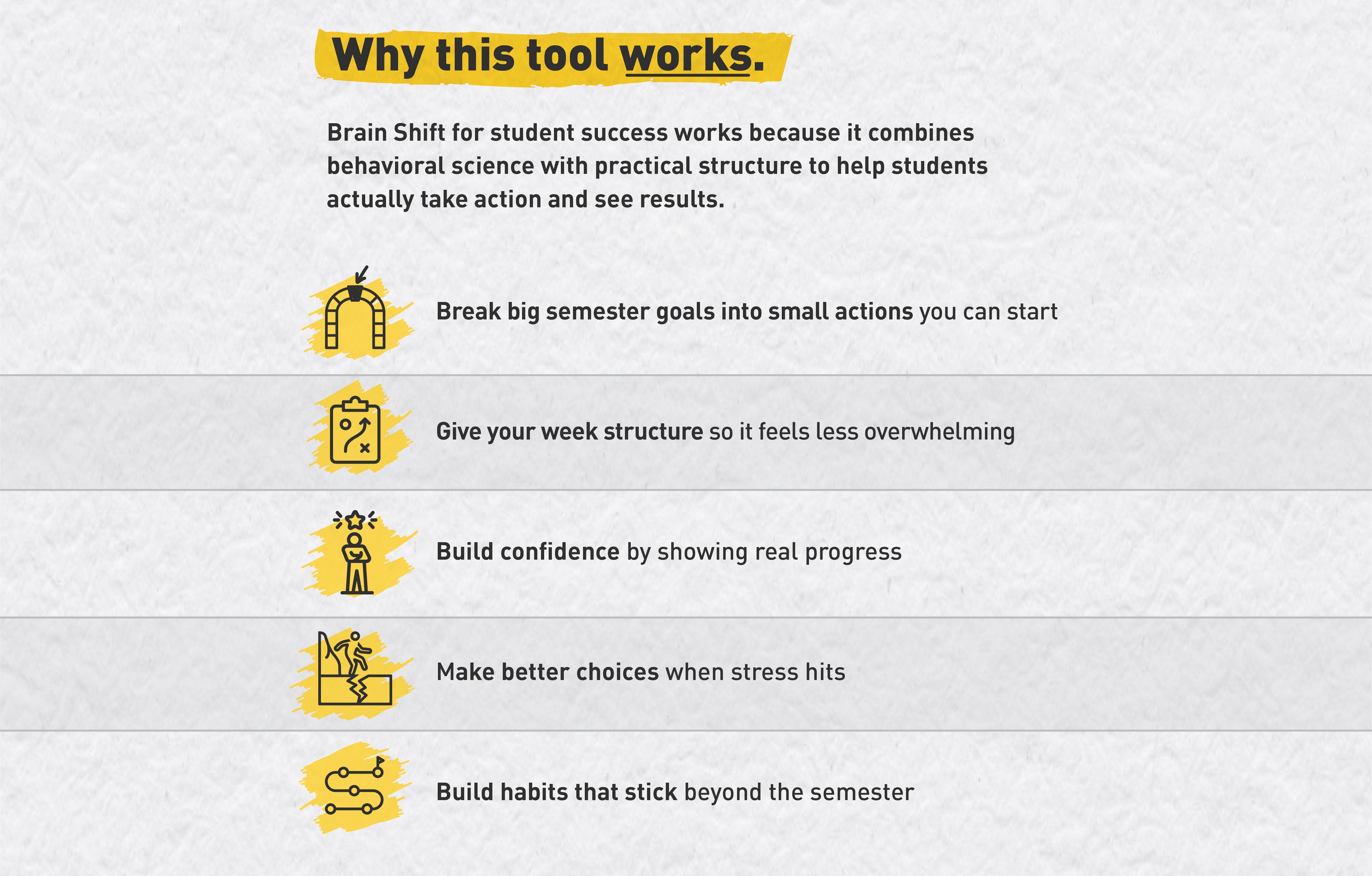 Together, these enhancements help institutions launch Brain/Shift effectively, equip campus teams to support students, and integrate behavioral science practices into the student experience.